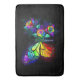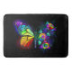 Rainbow, luminous, artistically painted monarch butterfly with bouquet of iridescent, bright, luminescent roses on black background. Rainbow butterfly.