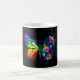 Rainbow, luminous, artistically painted monarch butterfly with bouquet of iridescent, bright, luminescent roses on black background. Rainbow butterfly.