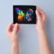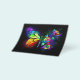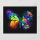 Rainbow, luminous, artistically painted monarch butterfly with bouquet of iridescent, bright, luminescent roses on black background. Rainbow butterfly.