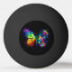 Rainbow, luminous, artistically painted monarch butterfly with bouquet of iridescent, bright, luminescent roses on black background. Rainbow butterfly.