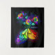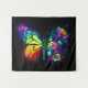 Rainbow, luminous, artistically painted monarch butterfly with bouquet of iridescent, bright, luminescent roses on black background. Rainbow butterfly.