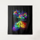 Rainbow, luminous, artistically painted monarch butterfly with bouquet of iridescent, bright, luminescent roses on black background. Rainbow butterfly.
