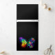 Rainbow, luminous, artistically painted monarch butterfly with bouquet of iridescent, bright, luminescent roses on black background. Rainbow butterfly.