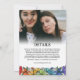 Double sided 2 in 1 photo wedding invitation for a gay or lesbian wedding with a photo of the happy couple on one side beneath an informal wedding invitation wording with your names in large letters beneath rainbow-coloured flowers and baby's breath. On the other side, add a second photo along with your wedding details like accommodation, website, registry, and anything else you need. A double sided floral LGBT wedding invitation in pride colours personalised with photos.