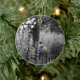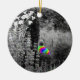Does visiting a garden make you happy? This is a happy garden with a little rainbow twist. The trees and flowers appear almost monochromish, mostly black-and-white with slightly coloured hues. The garden visitor, sitting on a bench, appears to be dressed in vivid rainbow colours. This image is derived from an original photograph of a beautiful botanical garden, with digital filters applied to give the visitor a shirt of many colours. This Christmas ornament is a a reminder of summer gardens that you can hang on a tree, add to your decor, or give as a holiday gift.