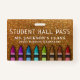 Gold metallic faux glitter background seems to sparkle behind a colourful rainbow set of crayons. Student hall pass information can be easily updated to list the purpose of the badge, the teacher's name, and school. Available in many other sparkly colours and designs.