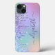 Girly phone case featuring colours of a unicorn rainbow faux glitter dripping down a purple background. Monogram with your name in a pretty purple script with swashes.