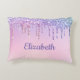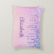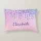 Cute girl's room pillow featuring rainbow faux dripping glitter against a pink background. Personalise with her name in purple script.