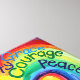 The words "Love" and "Spirit" are at the centre of a yellow gold heart. Rainbow colours radiate out from the heart with different inspirational words: Serenity, Grace, Faith, Courage, Happy, Peace, Hope, Friends, Fun, Laugh, Strength, Joy. Original art was painted on canvas.
