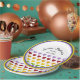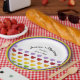 Add a colourful touch to your special day with these fun paper plates featuring a vintage inspired pattern of rainbow hearts with rainbow stripes accents and your own name and wedding or other details.