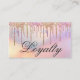 This girly and glamourous customer loyalty business card is perfect for a stylish and trendy professional businesswoman. It features faux printed sparkly rainbow colour glitter drips on top of a holographic iridescent foil background. The typography is an elegant cursive script with a modern serif font to match. The colour scheme includes pink, peach, blue, purple, gold, and coral. It's chic, pretty, unique, and luxurious; the perfect way to advertise your business and stylise your marketing and advertisement material for your customers.