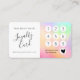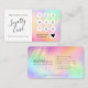 This is the perfect customer loyalty business card for a trendy, stylish, girly, and modern lash artist, makeup artist, nail technician, and many more professions. This design features a rainbow unicorn colour schemed holographic iridescent background with elegant handwritten script typography. It's modern, elegant, girly, unique, trendy, stylish, and cool; the perfect design to impress your customers.