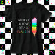 Add some WOW! to your wardrobe and let the world see your LGBT+ pride and/or ally side with this unique, eye-catching, bright, colourful, fun black t-shirt featuring my original diversity-of-LGBT+-love design: a very tall hand-drawn ice cream cone containing all the colours of the rainbow, alongside the quote--in large typography--"BELIEVE IN LOVE OF ALL FLAVORS." *Great for pride and/or support during Pride Month, pride events, and--even better--the whole year! : ) P.S. History shows this shirt is sure to get compliments!