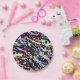 Retro 90s vibe of energetic graffiti splashes and a faux-holographic soft foil-y rainbow gradient.