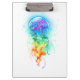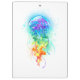 Large, iridescent, artistically drawn, bright jellyfish, with long tentacles on white, painted over with multicolored watercolor background. Rainbow jellyfish.