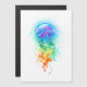 Large, iridescent, artistically drawn, bright jellyfish, with long tentacles on white, painted over with multicolored watercolor background. Rainbow jellyfish.