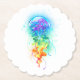 Large, iridescent, artistically drawn, bright jellyfish, with long tentacles on white, painted over with multicolored watercolor background. Rainbow jellyfish.