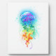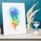Large, iridescent, artistically drawn, bright jellyfish, with long tentacles on white, painted over with multicolored watercolor background. Rainbow jellyfish.