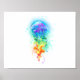 Large, iridescent, artistically drawn, bright jellyfish, with long tentacles on white, painted over with multicolored watercolor background. Rainbow jellyfish.