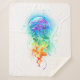 Large, iridescent, artistically drawn, bright jellyfish, with long tentacles on white, painted over with multicolored watercolor background. Rainbow jellyfish.