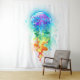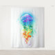 Large, iridescent, artistically drawn, bright jellyfish, with long tentacles on white, painted over with multicolored watercolor background. Rainbow jellyfish.