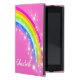 Cute pretty bright and colourful rainbow ipad mini folio or other iPad case of your choice. Original graphic patterned book style type case with a pink background. Customise with the long name of your choice. Example reads Elizabeth. Plus if found address details can be placed on the reverse just in case your child is absent minded on occasions, if you don't want this simply delete the text. This original case is designed by Sarah Trett.