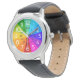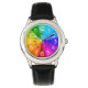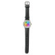 This colourful custom watch makes it easy for kids to learn how to tell time! Choose from a variety of genuine leather straps and bezel options. Our large, easy to read numbers are labelled "White Hours" and "Black Minutes" - the hands on most options are also labelled "hours" and "minutes" making it easy for kids to learn how to use the hands on a clock or watch to tell time. Great for kids in school, who love to draw or like art class as well as rainbows! Genuine stainless steel case, Japanese Quartz movement (accurate and durable), genuine leather strap, and 30 metre water resistance (water splashes, hand washing and rain - DO NOT swim or shower with this watch on).