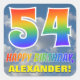 This vibrant, fun, and eye-catching birthday-themed sticker design features a blue sky with clouds pattern background, a large number "54" and "HAPPY BIRTHDAY," both having a multicolored rainbow spectrum inspired gradient pattern, and a personalised name. Fun and happy stickers like this might be given as a gift to somebody who is celebrating their fifty fourth birthday. [~Z0000374]