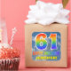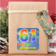 This exciting, vibrant, and eye-catching birthday-themed sticker design features a blue sky with clouds pattern background, a large number "61" and "HAPPY BIRTHDAY," both having a multicolored rainbow spectrum inspired gradient pattern, and a custom name. Fun and colourful stickers like this might be used when wrapping gifts being given in celebration of somebody’s sixty first birthday. [~Z0000374]