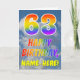 This fun and colorful 63rd birthday greeting card design features a representation of a blue sky with clouds, along with a large number "63" and the message "HAPPY BIRTHDAY," having a rainbow spectrum inspired gradient pattern coloring, on the front. The front also features the editable name of the card’s recipient. The inside features a personalized birthday greeting message, or could perhaps be cleared and left blank if a message is to be written by hand instead. A personalized birthday card like this might be a fun way to acknowledge somebody’s sixty third birthday. [~Z0000371]