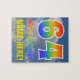 This fun, eye-catching, and exciting birthday themed puzzle design features a cloudy blue sky pattern background, a large number "64" and "HAPPY BIRTHDAY," both having a multicolored rainbow spectrum inspired gradient pattern, and a customisable name. A caring, colourful, and editable birthday puzzle like this might be a fun way to send birthday wishes to somebody who is celebrating their 64th birthday. [~Z0000375]