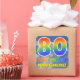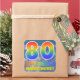 This eye-catching, fun, and vibrant birthday-themed sticker design features a blue sky with clouds pattern background, a large number "80" and "HAPPY BIRTHDAY," both having a multicolored rainbow spectrum inspired gradient pattern, and a customisable name. Fun and colourful stickers like this might be used when wrapping presents being given in celebration of somebody’s eightieth birthday. [~Z0000374]