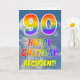 This fun and colourful 90th birthday greeting card design features a depiction of a cloudy blue sky, along with a large number "90" and the message "HAPPY BIRTHDAY," having a rainbow spectrum inspired gradient pattern colouring, on the front. The front also features the custom name of the card’s recipient. The inside features an editable birthday greeting message, or could perhaps be cleared and left blank if a message is to be written by hand instead. A customisable birthday card like this might be a fun way to send a message in celebration of somebody’s ninetieth birthday. [~Z0000371]