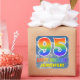 This eye-catching, exciting, and fun birthday-themed sticker design features a blue sky with clouds pattern background, a large number "95" and "HAPPY BIRTHDAY," both having a multicolored rainbow spectrum inspired gradient pattern, and an editable name. Colourful and fun stickers like this might be a fun gift for somebody who is celebrating their 95th birthday. [~Z0000374]