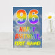 This fun and colorful 96th birthday greeting card design features a depiction of a blue sky with clouds, along with a large number "96" and the message "HAPPY BIRTHDAY," having a rainbow spectrum inspired gradient pattern coloring, on the front. The front also features a customized recipient name. The inside features an editable birthday greeting message, or could perhaps be cleared and left blank if a message is to be written by hand instead. A customizable birthday card like this might be a fun way to send a message in celebration of somebody’s ninety sixth birthday. [~Z0000371]