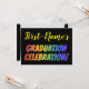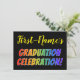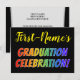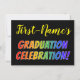 This fun, vibrant graduation celebration invitation design features a personalised name, and the message "GRADUATION CELEBRATION!" with letters having a rainbow spectrum inspired gradient pattern. The back features personalised information about the graduation celebration event. Invitations like these might be used to invite guests to a party or celebration being held for somebody who has just gradated from high school, college, university, or some other program of study.