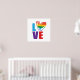 Gay pride themed square poster features large colourful LOVE typography with rainbow scribble heart