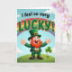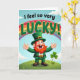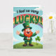 This St. Patrick's Day card shows a smiling leprechaun with his arms spread wide, like he’s greeting a close friend with an easy, affectionate welcome. He wears an emerald-green suit and matching top hat with a gold buckle, and his orange-red beard and mustache frame a wide, open grin. Behind him, a rainbow 🌈 curves across a light blue sky with thin white clouds, setting a cheerful outdoor scene. The words “I feel so very” sit above the main message in smaller, slightly tilted green lettering, leading into “LUCKY!” in large deep-green letters edged in gold. The leprechaun stands on a rolling green hill with gentle shading, and the soft light adds small highlights along his hat and sleeves. Off to the right, a three-leaf clover ☘️ rises from the grass, with faint shamrocks scattered across the foreground. A friendly line about sharing St. Patrick's Day sentiments.