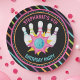 Rainbow Neon Bowling Birthday Party Paper Plate. This design features bowling pins, a bowling ball, and stars. Bright rainbow neon colours really stand out against the black background. Personalise this custom invite design with your own party details.