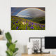 This photo features a rainbow over a field of bluebonnet wildflowers in the shadow of a mountain range.