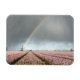 Rectangular photo magnet with a rainbow and dark clouds during a spring storm over a landscape with an old windmill and pink hyacinth flowers in the dutch Bulb Region in the Netherlands.