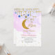 Rainbow Over the Moon Baby Shower Invitation for girl with a moon, stars, and beautiful faux gold glitter.