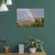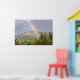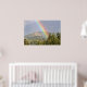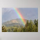 Photo of a colourful rainbow over the mountains with lots of evergreen trees and mist. Customise this rainbow picture with your own text and have it printed on your choice of many different products.