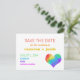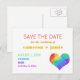 Colourful and fun save the date postcard with a rainbow heart and fonts in rainbow colours on a white background.