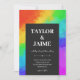 Wedding invitation for a gay or lesbian wedding with a modern typography design in black and white against a rainbow coloured background.