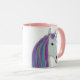 This is a beautiful unique unicorn coffee mug. It is white on the exterior and has a large unicorn head with pretty pastel rainbow colour hair on both sides of the mug. The inside of mug is solid cotton candy pink and you may change the colour if you'd like.