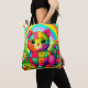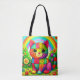 This vibrant tote bag design features an adorable patchwork-style rainbow cat sitting among bright flowers beneath a glowing rainbow. The artwork blends whimsical charm with bold, saturated colors and playful patterns, creating a joyful and eye-catching design. Perfect for cat lovers and anyone who enjoys cheerful, colorful art.