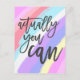 Send someone positive vibes with this vibrant design with a background in a diagonal rainbow pattern in bright coral, yellow, white, lilac and blue, and the words of encouragement quote Actually You Can in an elegant script.