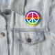 A pin-back button with a white peace sign on top of vibrant rainbow stripes. A political statement to support equality or anti-war sentiments.