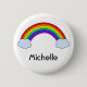 A rainbow emerges from the clouds on this button with a name below in black letters. Personalise with your own name or other text. Customise to change font style and colour.